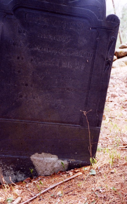 Ann Cochran / died / Nov. 18, 1843 / AE 74 In memory of / Miss Jean Cochran / daughter of Mr. Abraham Cochran / and Mrs. Jannet his wife / who died May 25th / 1786, in the 22nd year of her age Erected / in memory of / Mr. Andrew Cochran / son of Mr. Abraham Cochran / and Mrs. Jannet his wife who died Sept. 18th / 1781 / in the 21st year of his age Erected / in memory of / Mr. Abraham Cochran / who departed this life / Janr ye 15th 1776 / in the 47th year / of his ageDeacon James and Jennet (Lesley) Ferson moved to New Boston sometime after 1744,
