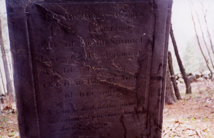 In memory of Mrs. / Jane Gregg / wife of Lieut. Samuel Gregg, / who departed / this life Dec. 25th 1800 in the 31st year of her age/ A son & dau of the above mentioned person / born & died Nov. 30thResearch is pending