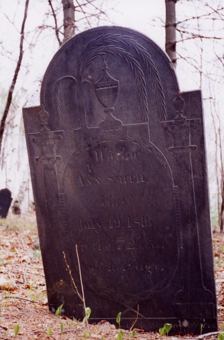 "In Memory of / Mr. James Gregg / who died Dec. 31st / 1805 in the 63rd year / of his age / Tis finished and the Spirits fled Regardless of our ancious cares He slumbers with the silent dead But lives we hope above the skies" "In Memory of / Mrs. Jennet Gregg / Relict to Mr. James / Gregg; who died / January 12th 1820 / In the 82d year of her age / The young may live / but the old must die" (These stones are of fine black slate, well preserved and are side by side)Deacon John Smith was a son of Thomas Smith. Ann (Brown) Smith was his second wife.