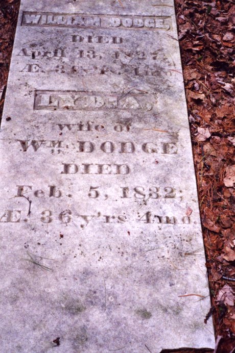 William Dodge / died April 13, 1827 / AE 38 yrs 4 mos / Lydia wife of Wm Dodge / died / Feb. 5, 1832 / AE 36 yrs 4 mos/ (This stone flat on the ground)Research is pending